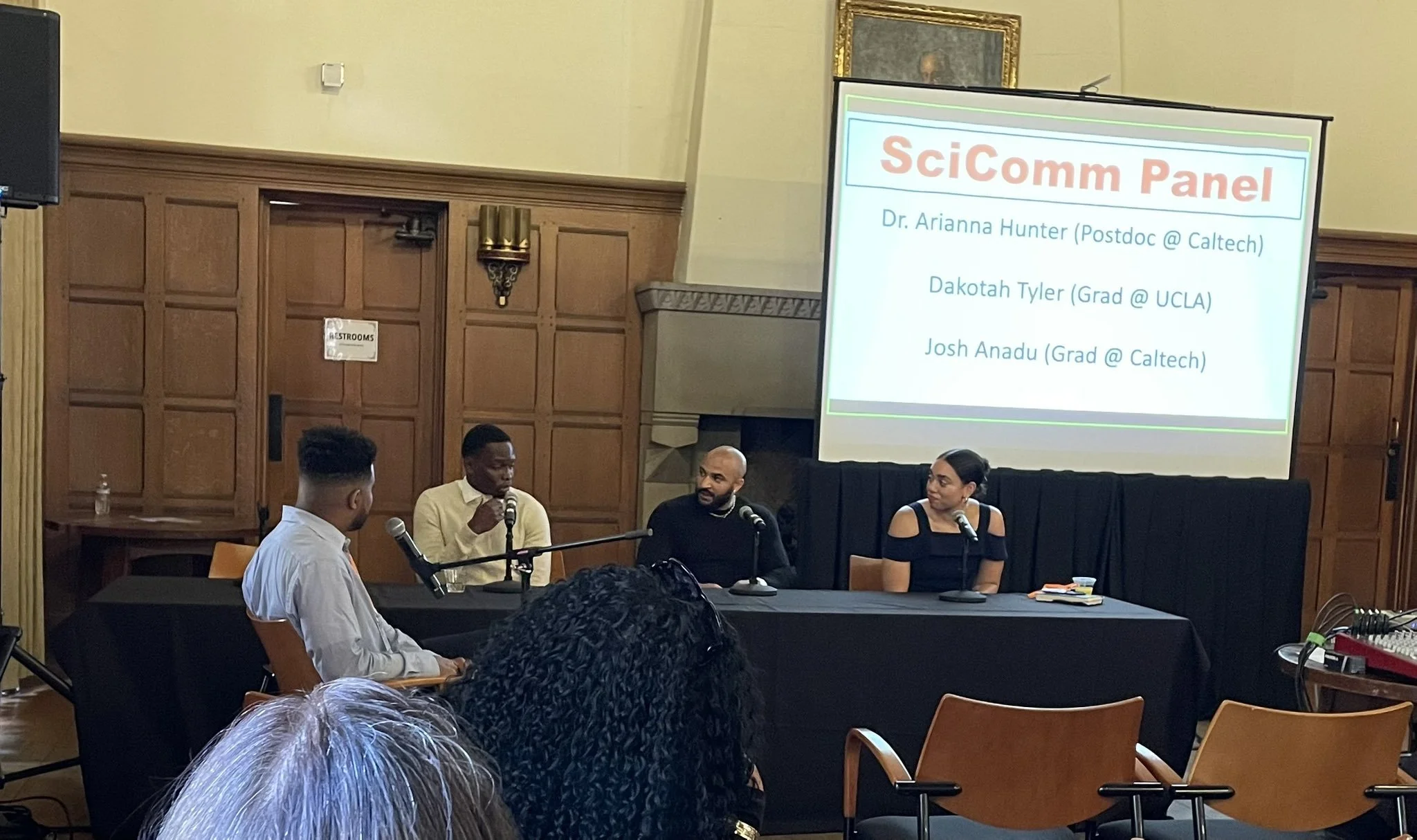 Anadu spoke about the video and his experiences as a Black scientist and YouTuber while on a science communication (SciComm) panel at the Conference for Emerging Black Academics in STEM (CEBAS) hosted by Caltech on May 12. The panel, moderated by conference co-organizer and Caltech neuroscience graduate student Thomas Henning, also featured Arianne Hunter, Caltech Presidential Postdoctoral Scholar in chemistry, and Dakotah Tyler, an astrophysics graduate student at UCLA.