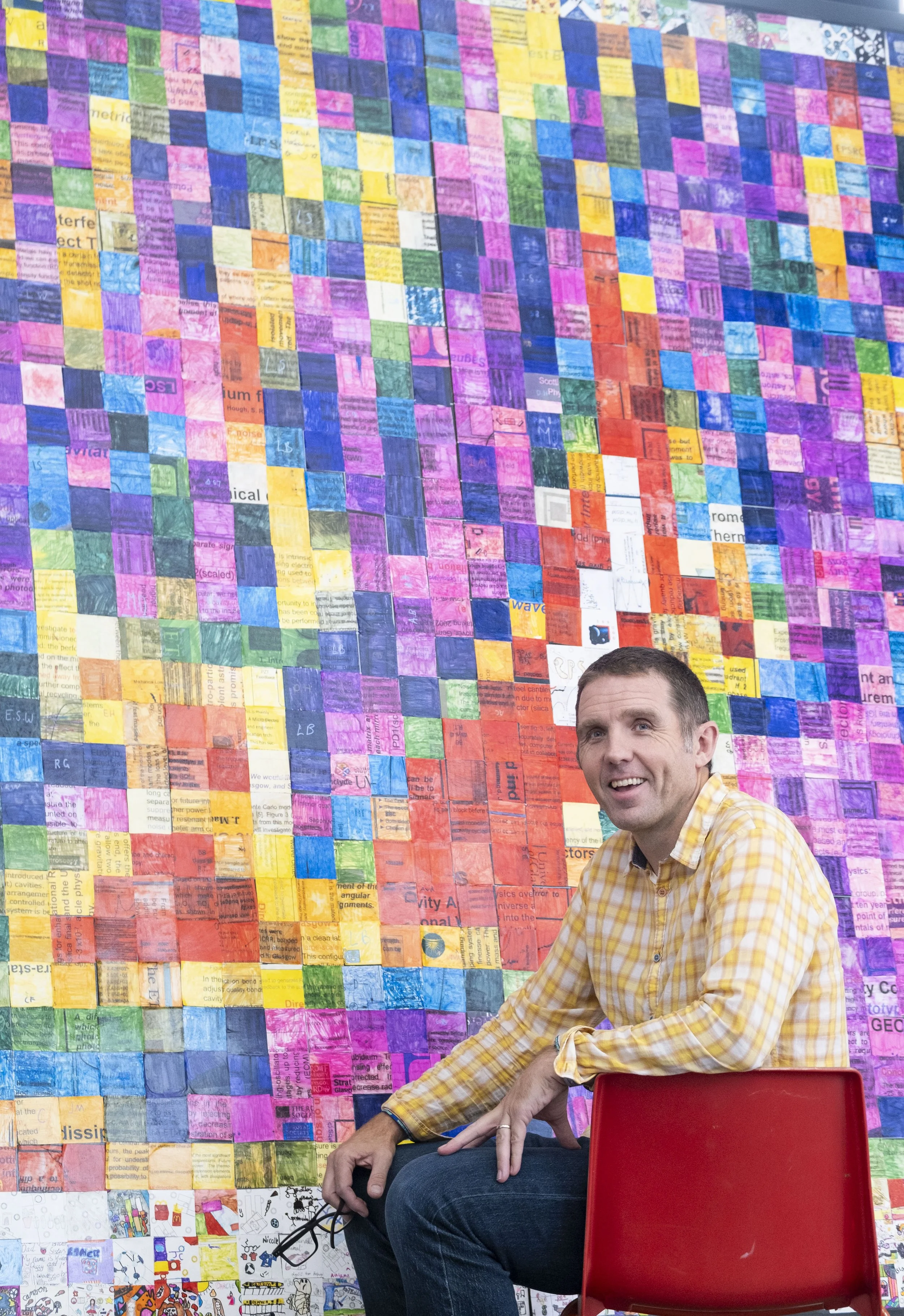 Calum Torrie is the head of system science and engineering for the Laser Interferometer Gravitational-wave Observatory (LIGO), and the LIGO associate director for Caltech. In June, he visited Cardonald Primary School, his childhood school in Glasgow, Scotland, to talk about his work and present a framed mosaic of 1,156 science-themed pictures made by the pupils, each placed so as to represent the historic gravitational-wave signal picked up by the twin LIGO observatories a decade ago. The visit was organized by researchers from the University of Glasgow, where Torrie is also an honorary research fellow. LIGO is funded by the National Science Foundation and operated by Caltech and MIT, which together conceived and built the project.